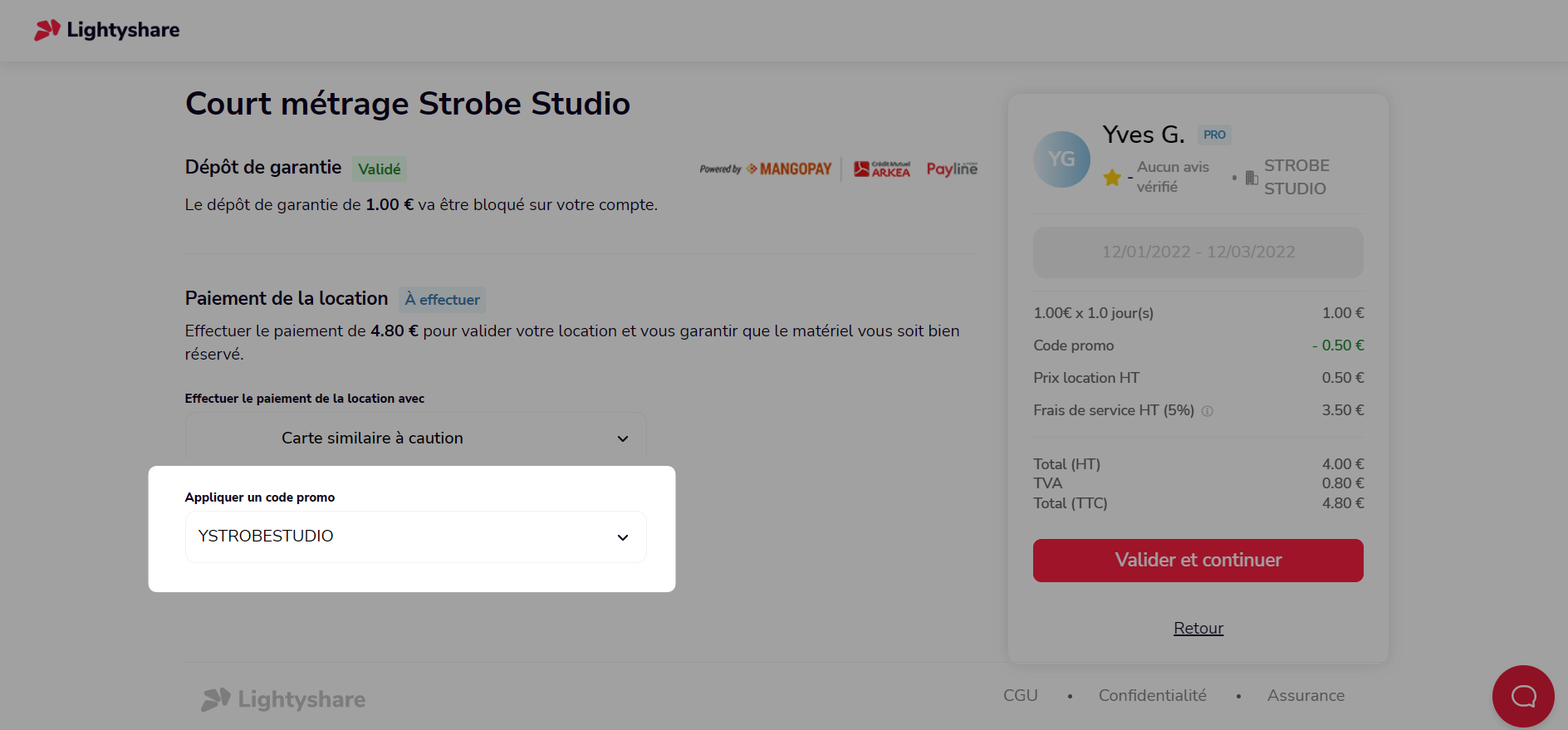 Si vous avez ajouté un code promotionnel Lightyshare réduisant les frais de service, celui-ci sera automatiquement appliqué à vos paniers et de demande de location.